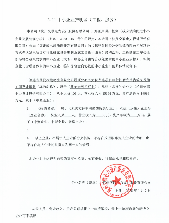 福建省國資冷鏈物流有限公司屋頂分布式光伏發(fā)電項目可行性研究報告編制及施工圖設(shè)計服務(wù),具體詳見成交供應(yīng)商響應(yīng)文件。 |