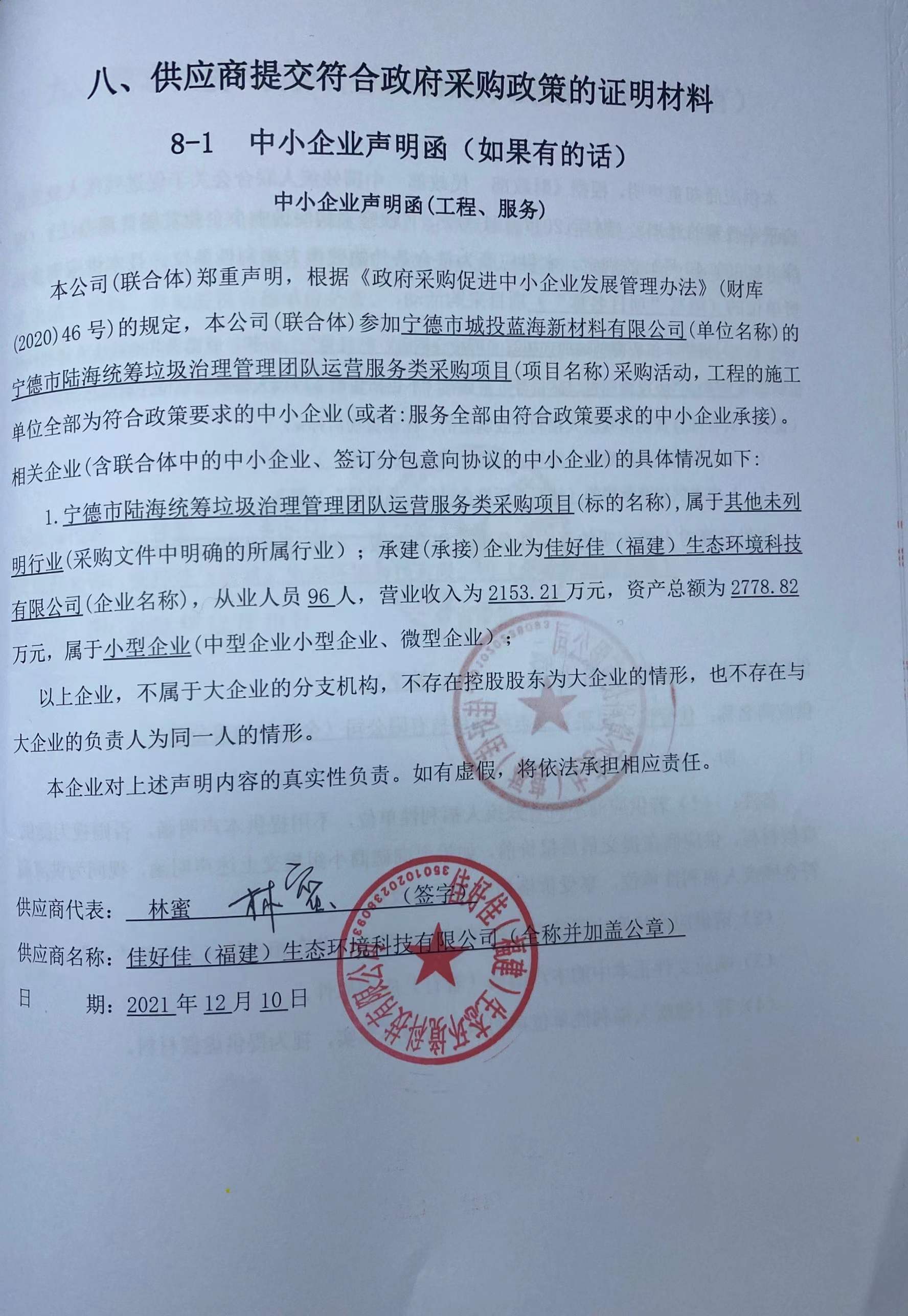 | 1 | 佳好佳(福建)生態(tài)環(huán)境科技有限公司 | 寧德市陸海統(tǒng)籌垃圾治理管理團隊運營服務類采購項目 | 服務實施范圍為蕉城、福安、霞浦、福鼎4個縣區(qū)沿??傞L約1046公里岸線及30個沿海鄉(xiāng)鎮(zhèn)及行政村的村鎮(zhèn)道路,具體詳成交人的響應文件。 | 垃圾桶每日無垃圾積壓、道路清掃保潔應達到“三無三凈”,具體詳成交人的響應文件。 | 一年 | 根據(jù)國家、省市發(fā)布的相關標準、地方相關標準以及結(jié)合采購單位制定服務標準,具體詳成交人的響應文件。 |